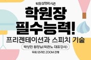 [무료] 학원장 필수능력!프리젠테이션과 스피치 기술 (설명회 PPT 작성기술과 스피치기술 ) [강의를 통해 얻을 수 있는 이득] 원장님들이 기본적인 설명회 구성과 스피치 기술을 이해하고 적용할 수 있도록 하는 것 ---------- ☞ 주관 : 학관노 ☞ 강사 : 박상민 원장님(학관노 대표강사, 성실사 주임교수) ☞ 일정 : 12.8(금) 오전 9:30~12:00 ☞ 교육비 : 무료 / 온라인 Zoom 진행 ☞ 신청하기 : https://bit.ly/3sTJ31X [강의 목차] Part1. 강연 프리젠테이션 구성 필수기법 1. 핵심 메시지 정의 및 구조화 2. 청중의 관심을 끌기 위한 전략 Part2. 시각 자료 활용 기법 1. 강력한 시각적 스토리텔링 기법 2. 슬라이드 및 기타 미디어 자료의 효과적인 설계 Part3. 스피치 필수기법 1. 학부모의 관심사와 질문에 효과적으로 응답하는 방법 2. 상호작용 증진을 위한 대화 전략 [강사인사말] 안녕하세요. 학원의 기업 시스템을 연구하는 기업 시스템 연구원 대표 박상민입니다. 이제 학원설명회 시즌이 돌아옵니다. 설명회 많이 하시죠? 광고할때 가장 중요한 것은, 학원에 오게 만드는 것