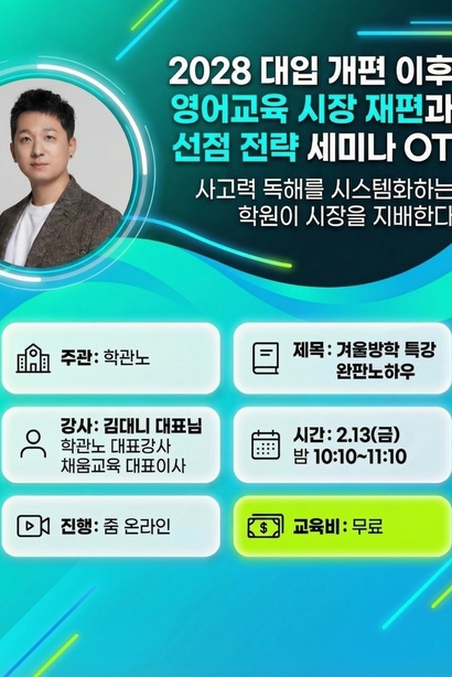 [Pre Course(무료)+실전과정] 나도 이제 진로진학 전문가! ㅣ 진로진학사관학교 대입(고입) 학생부종합전형 마스터과정 - 박인오 소장님(학관노 대표강사, 대치동 1타 입시컨설턴트) 진로진학사관학교 대입(고입) 학생부종합전형 마스터과정 (대치동 1타 진로진학 컨설턴트와 함께 하는 실전과정) 나도 이제 진로진학 전문가 ... 초보에서 시작해서 전문가로 바뀌는 시간, 단 7주 1. 학생부종합전형 설계와 연간 관리 비법 전수 2. 나도 입학사정관 ... 합불사례 분석과 평가 실습까지 3. 배운 내용을 학종관리 특강 및 상담으로 바로 연결 [2.20(금) 온라인 Pre Course - 무료] [3.7(토)~4.13(월) 유료 - 온라인 단기 속성과정] [3.26(목)~6.11(목) 유료 - 오프라인 프리미엄 심화과정 ㅣ 장소: 대구] [Pre Course - 무료] ▪ 주관 : 학관노 ▪ 제목 : 진로진학사관학교 대입(고입) 학생부종합전형 마스터과정 ▪ 강사 : 박인오 소장님 (학관노 대표강사, 대치동 1타 입시컨설턴트) ▪ 장소 : 온라인 ▪ 일시 : *1강, 2강 내용이 다릅니다. Pre 1강 2.20(금) 오전 10:10~11:50 Pre 2강 2.20(금) 밤 10:10~11:50 [Pre Course 목차] (1강) 왕초보도 이해되는 대학입시의 기초 1. 진로진학컨설팅에 대한 이해 2. 대학입시제도에 대한 이해 3. 진로진학사관학교 정규수업 안내 (2강) 고교학점제와 학생부종합전형 1. 2028학년도 대입개편안 2. 고교학점제 이후 대입의 변화와 준비 3. 진로진학사관학교 정규수업 안내 * Pre Course만 참가하는 경우 별도의 교육자료를 제공하지 않습니다. * 정규수업 신청자만 녹화영상 및 교육자료가 제공됩니다. [신청하기] * 신청시 휴대폰 번호를 정확히 입력해주세요! *1강, 2강 내용이 다릅니다. ▪ 일정 : 1강 2.20(금) 오전 10:10~11:50 ▪ 신청 : https://bit.ly/4a7FFlv ▪ 일정 : 2강 2.20(금) 밤 10:10~11:50 ▪ 신청 : https://bit.ly/4rr1nYG * 크롬브라우저 또는 모바일로 신청가능합니다. * 온라인 설명회 안내는 신청자에게 따로 문자 안내됩니다. * 참가자 제외 1. 학원장이 아닌 업체 관계자 2. 타학원 커뮤니티 운영진 및 강의자 [강사 인사말] 안녕하세요! 대학입시 및 진로진학 전문가 박인오 소장입니다. 고교학점제 시대를 앞두고 교과와 비교과는 더 이상 다른 용어가 아닙니다. 그래서 진로진학은 초·중등부만 지도하는 원장님들도 반드시 알아야 할 필수 교육입니다. 진로진학을 함께 공부하고 성장하고자 하는 원장님들을 초대합니다. 입시 초보자도 걱정 마세요. 기초부터 배워갑니다. 진로진학 전문가로 가는 첫 걸음에 함께 하세요. 초보에서 시작해 전문가로 바뀌는데 필요한 시간은 단, 7주 진로진학사관학교 마스터과정과 함께라면 원장님도 이제 진로진학 전문가입니다!!! 대치동 1타 컨설턴트로 활동중인 현장 전문가이자 대학원 정규 석사학위과정에서 진로진학을 가르치는 교수자로서 학원 현장에 적용할 수 있도록 책임지고 끝까지 이끌어 드립니다. 내 아이들의 인생을 바꿀 시간과 열정만 가지고 오세요. [교육 후기] -수원 백** 원장님- -대구 김** 원장- -용인 윤** 원장님- -광주 이** 원장님- -동작 안** 원장님- -부산 조**원장님- -경주 이** 원장님- -보령 황** 원장님- -성북 허** 원장님- -용인 이** 원장님- -울산 이** 원장님- [온라인 단기 속성 과정] 온라인 단기 속성과정은 바쁜 시간을 쪼개서 고입/대입 상담 및 진로진학 프로그램을 배워서 즉각적으로 학원에 적용하고 싶으신 분들께 추천합니다. 이론수업만이 아니라 소그룹별 개인지도를 통해 우리 학원은 무엇을 먼저 시작하면 좋을지 현실적인 도움을 드립니다. [정규수업 일정 및 목차] - 교육 시간 확인 잘 해주세요^^ 1. O.T. * 필수참가 3.7(토) 밤 20:00~21:00 2. Pre Course 기본과정 * 기초가 부족한 분들만 선택 수강 Pre-3강 3.7(토) 밤 21:00~22:00 학교생활기록부 항목별 이해 * Pre-1강, 2강 : 2.20(금) 사전교육 녹화영상 제공 3. 이론수업 3.9(월) 오전 9:00~12:00 (대입) 학생부종합전형 평가요소, 서류심사, 면접평가 3.23(월) 오전 9:00~12:00 (고입) 고교유형과 진학준비, 자기소개서, 면접평가 4.6(월) 오전 9:00~12:00 (종합) 학생부종합전형 설계와 연간관리, 학종관리 시스템 구축 4. 실습수업 3.16(월) 밤 22:10~23:50 나도 입학사정관, 대입 학생부 평가 실습 3.30(월) 밤 22:10~23:50 학생부 분석과 설계 실습 4.13(월) 밤 22:10~23:50 학생부 세부항목(과목별 세특, 창체) 기재 실습 5. 실전적용코칭 * 소그룹별 개별지도 3월~5월 평일 야간 줌 미팅 (날짜는 추후 확정) 학원 상황이 비슷한 소그룹으로 구분 (중복 참가 가능) 소그룹별 공통 및 개별적인 상황에 대한 세부적용방법 지도 ▪ 온라인 단기 속성과정 : 3.7(토)~4.13(월) 7주 (23시간) ▪ 교육비 : 49만원 ▪ 마감기한 : 3.6(금) 오후 3시까지 ※기간내 신청바랍니다. 교육 마감후 환불 불가! ▪ 신청하기 : https://bit.ly/3NYbyFB 부탁드립니다! 신청하시면 오픈채팅방에 초대될 예정입니다. 바로 입장해주셔야 원할한 교육이 가능하며, 교육문의는 채팅방에 입장해주셔서 문의주세요~ [교육안내] 진로진학사관학교 대입(고입) 학생부종합전형 마스터과정은 pre course 기본과정 -> 이론 수업 -> 실습 및 Q&A 수업 -> 실전적용 코칭(개별지도) 으로 구성되어 있습니다. 1) pre course는 - 입시용어부터 시작하는 대학입