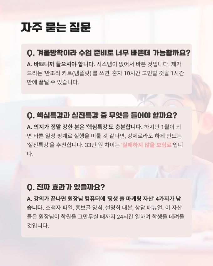 A. 바쁘니까 들으셔야 합니다. 시스템이 없어서 바쁜 것입니다. 제가 드리는 **'반조리 키트(템플릿)'**를 쓰면, 혼자 10시간 고민할 것을 1시간 만에 끝낼 수 있습니다. 이번에 시스템을 안 잡으면 3월에도 똑같이 바쁘고 힘들 것입니다.