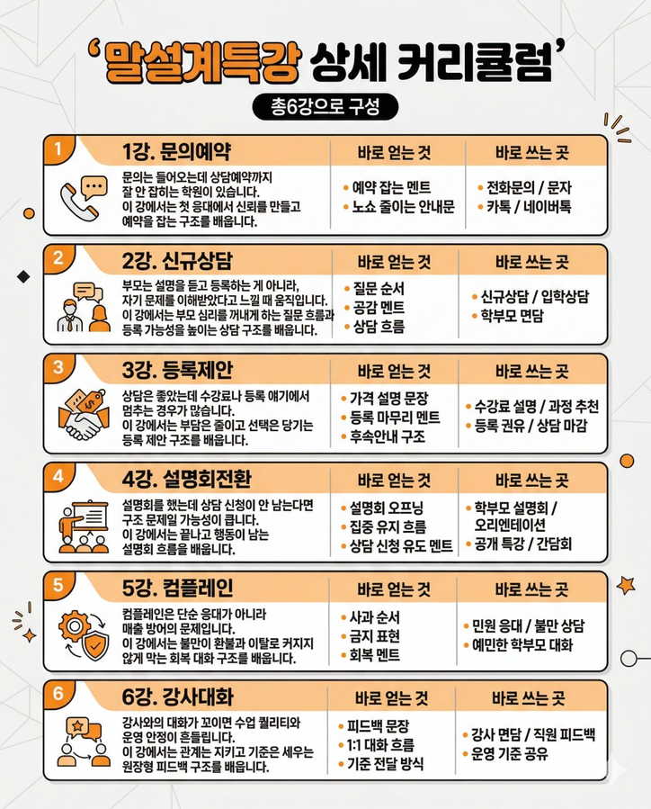 설명회, 상담, 컴플레인, 협상, 피드백처럼 학원장이 실제로 부딪히는 장면마다 필요한 말의 구조를 정리하는 6강 시그니처 강의입니다. 배우고 끝나는 것이 아니라, 바로 현장에 가져가 쓸 수 있게 설계했습니다.