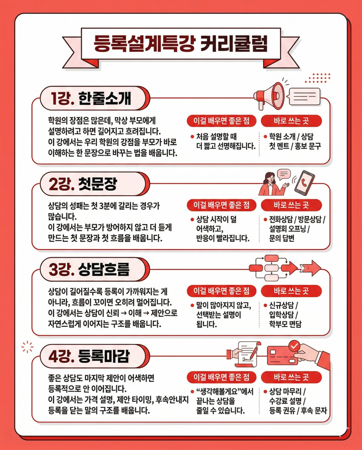 부모가 반응하는 문장, 상담이 풀리는 흐름, 등록으로 이어지는 제안 구조를 배우는 4강 실전 강의입니다.