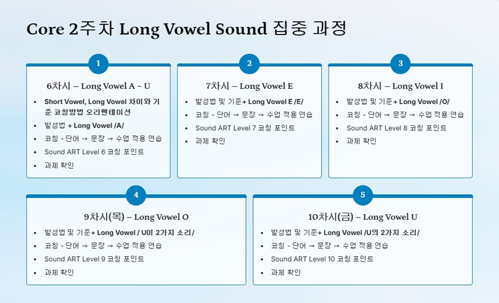1주차 Short Vowel 5개 소리 학습 후 바로 Sound Art Level 1~5 수업 진행이 가능하며, 실제 수업 시연과 피드백도 포함됩니다.