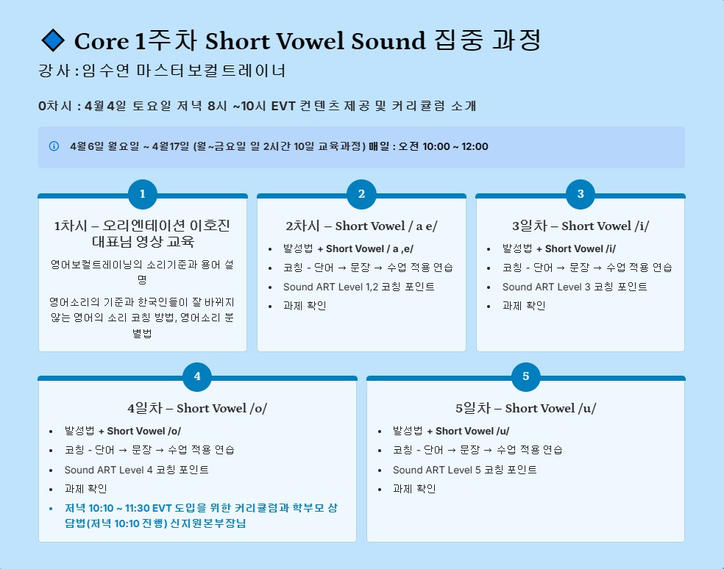 ※ 매일 수업을 통해 학습 흐름이 끊기지 않으며, 단기간에 발음 원리 이해 → 소리 체득 → 수업 적용까지 완성하는 구조입니다.