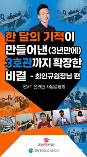 [온라인·무료] EVT|한 달의 기적이 만들어낸 (3년 만에) 3호관까지 확장한 비결 - 최인규 원장님(Roy Choi) ▪ 주관 : EVT ▪ 제목 : 한 달의 기적이 만들어낸 (3년 만에) 3호관까지 확장한 비결 ▪ 강사 : 최인규 원장님(Roy Choi) ▪ 상세 일정 및 신청하기 신청시 휴대폰 번호를 정확히 입력해주세요! (1차, 2차 동일한 내용으로 진행됩니다. 편한 시간에 접속하세요.) 1차: 2.5(목) 오전 10:10~12:00 → https://bit.ly/4rdf25p 2차: 2.5(목) 밤 10:10~12:00 → https://bit.ly/4q7ttXH - 크롬브라우저 또는 모바일로 신청가능합니다. - 온라인 설명회 안내는 신청자에게 따로 문자 안내됩니다. ▪ 참가자 제외 1. 학원장이 아닌 업체 관계자 2. 타학원 커뮤니티 운영자 및 강의자 "텅 빈 교실에서 시작해 3년 만에 100평 규모 3호관 확장까지!" 광고 없이 오직 '소개'만으로 만들어낸 청주 올바른어학원 최인규 원장님의 생생한 성공 노하우를 공개합니다. [최인규 원장 인사말] 안녕하세요. 청주에서 올바른어학원을 운영하고 있는 원장 Roy(최인규)입니다.