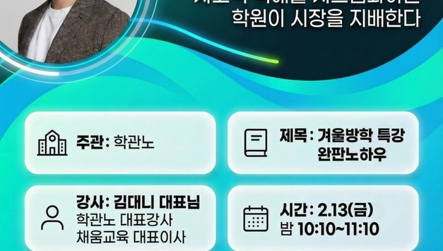 [온라인·무료] 커리큘럼을 바꾸지 않으면, 결과는 더 빨리 무너집니다 부제:알파영어논술로 만드는 서술형 맞춤 시간표와 커리큘럼 - 김대니 대표님(학관노 대표강사, 채움교육 대표) [설명회 안내] * 주관 : 알파영어논술, 학관노 * 제목 : 커리큘럼을 바꾸지 않으면, 결과는 더 빨리 무너집니다.(부제:알파영어논술로 만드는 서술형 맞춤 시간표와 커리큘럼) * 강사 : 김대니 대표님(학관노 대표강사, 채움교육 대표) * 시간 : 1.22(목) 오전/밤 10:10~11:30 * 진행 : 무료 / 온라인 줌 설명회 [신청하기] 신청시 휴대폰 번호를 정확히 입력해주세요! * 시간 : 1.22(목) 오전 10:10~11:30 * 신청하기 : https://bit.ly/49OxOKx * 시간 : 1.22(목) 밤 10:10~11:30 * 신청하기 : https://bit.ly/4sACkUh - 오전/밤 설명회 동일합니다. 택1해서 신청해주세요.^^ - 크롬브라우저 또는 모바일로 신청가능합니다. - 온라인 설명회 안내는 신청자에게 따로 문자 안내됩니다. * 참가자 제외 1. 학원장이 아닌 업체 관계자 2. 타학원 커뮤니티 운영자 및 강의자 [인사말]