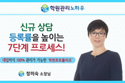 [5.29(화) 무료] 신규상담 등록률을 높이는 7단계 프로세스!(1일차) (대입까지 100% 관리가 가능한 [학원포트폴리오] - 정미숙소장님) 정미숙 소장님이 5년이상 학생의 모든 학습스토리를 담아 원스톱으로 관리할 수 있는 [학원포트폴리오]를 완성하고, 5년간 임상을 마친 검증된 교육을 학관노에서 진행합니다.^^ 안녕하세요? 학관노에서 포트폴리오 실전교육을 맡게된 정미숙 소장입니다. [1일차] 교육의 목표는 신규 학생과 학부모에게 학원의 전문성과 신뢰도를 높이는 체계적인 상담으로 신규등록률을 높이는 것을 목표로 합니다. 목표를 이루기 위해서 학원포트폴리오를 활용한 아래와 같이 7단계 상담프로세스의 노하우를 전해드립니다. Step1. 코칭서약 - 코칭서약을 통해 학원에 대한 신뢰를 높임 - 진지하고 솔직한 상담 가담 가능하게 함 - 차후 성장과정의 기초자료로 보관 Step2. 최초 정보 진단 - 최초 학생의 교과, 비교과 학습 상황을 분석 - 학생들의 성장 추이를 객관적으로 파악 - 학생의 기본 정보를 등록시부터 보관할 수 있어 다음 상담 자료로 활용 Step3. 최초 코칭 - 진단으로 도출된 학생의 학습력, 성격, 자기주도학습력 등에 대한 상담으로 학